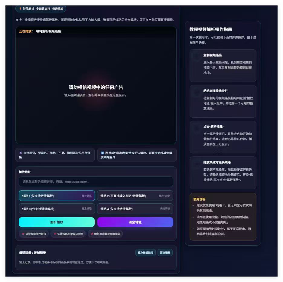 - 其他线路:去视频平台复制剧集链接 → 粘贴到解析框 → 选择线路解析